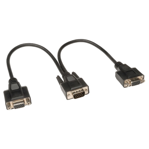 Tripp Lite's 1 ft. SXGA/UXGA Monitor "Y" Splitter cable provides an inexpensive alternative for splitting the video signal from your PC's VGA port to 2 High-Resolution monitors that use standard 15-pin plugs. 75-ohm coax conductors used for RGBHV signals allow for use with monitors with up to 1600 x 1200 resolutions. Perfect for laptops to display on a separate, larger monitor. Use for short distance applications only. For applications that require longer distances and highest resolution, see Tripp Lite B114-002-R, powered 2-Port Splitter, or, B114-0H4, powered 4-port Splitter. Tripp Lite Lifetime Warranty.