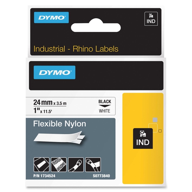 1" flexible nylon label tape is specifically designed for wire and cable marking as well as other curved surfaces. Strong adhesion and flexibility make it ideal for industrial use, even where your label will encounter dirt and oil. 24mm labels are compatible with Dymo Rhino 6500, 6000, 5200.